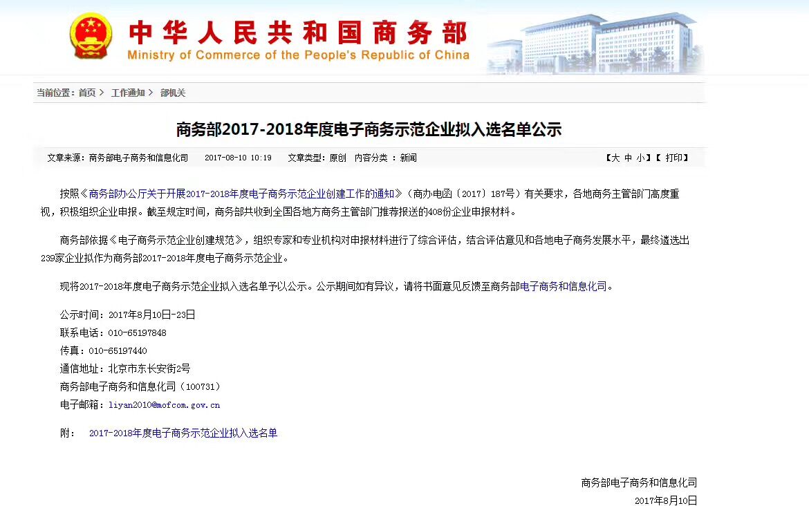 商务部按照《2017-2018年度电子商务示范企业创建规范》有关要求,组织专家和专业机构对申报材料进行综合评估,各地商务主管部门高度重视,积极组织企业申报。最终郑州悉知信息科技股份有限公司再次评选为国家级电子商务示范企业。