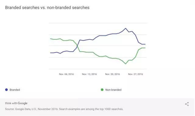 除了搜索黑色星期五的相关信息外,人们还会在假日季对品牌进行研究。在 11 月初,与品牌无关的黑色星期五相关搜索(如“黑色星期五家具促销”和“黑色星期五化妆品促销 2016”)多于与品牌相关的搜索量。但在黑色星期五购物季(为期四天)前的两周半内,黑色星期五相关的搜索多半都是与品牌相关的了(如“Ashley 家具黑色星期五”、“丝芙兰黑色星期五 2016”)。这是因为消费者缩小了他们的选择范围,将目光聚焦到了他们想要购买的特定商品上。