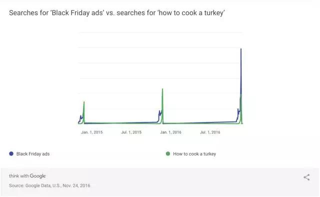 “黑色星期五广告”和“如何烹饪火鸡”的搜索量对比