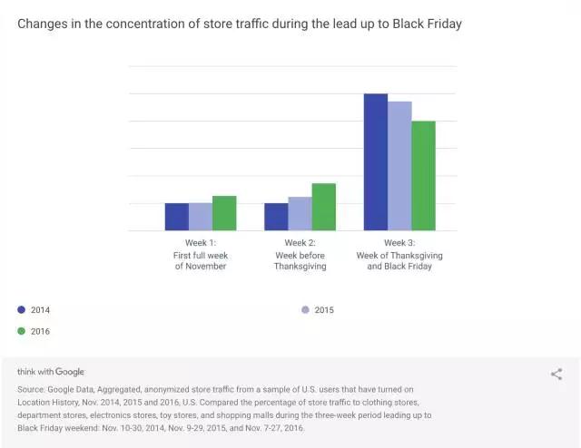举个例子,来自普华永道的行业报告指出,黑色星期五实体店的客流量正在下降。事实上,黑色星期五已变成了持续一周的活动。在黑色星期五开始前的三周时间里,尤其是黑色星期五的上一周,零售商明显感受到了较高的客流量。